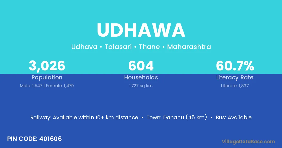 Dahanu (45 km) is the nearest town to Udhawa village for major economic activities and is located approximately 45 km away.