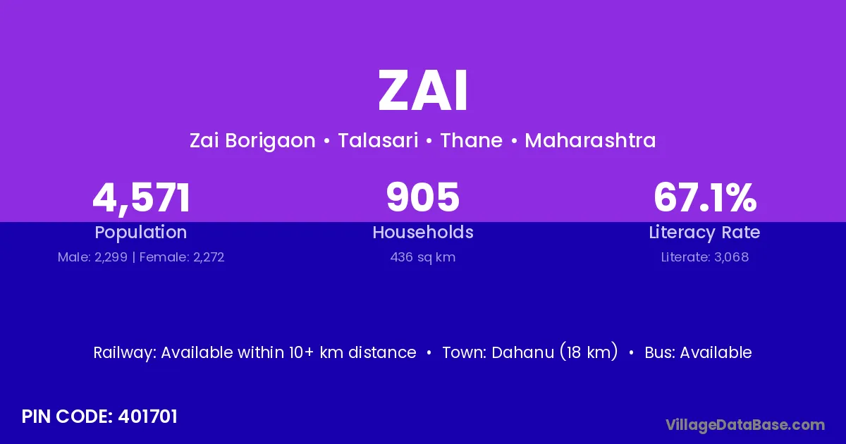 Dahanu (18 km) is the nearest town to Zai village for major economic activities and is located approximately 18 km away.