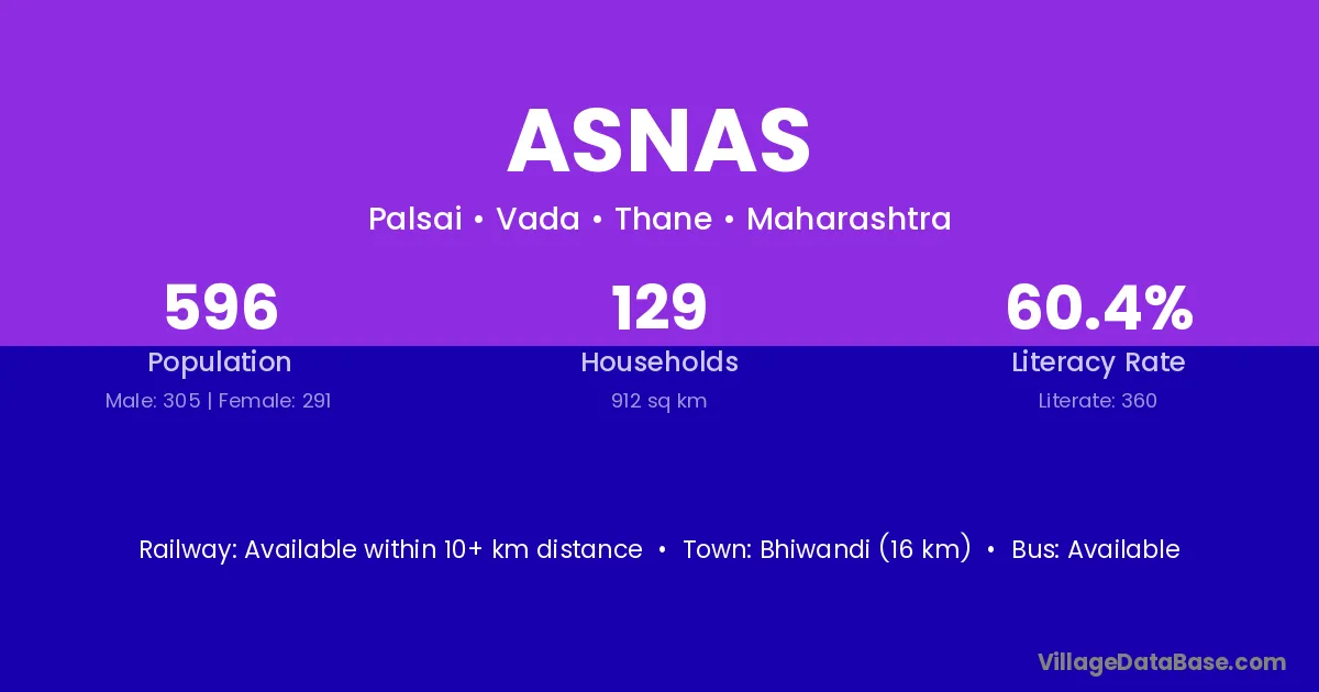 Bhiwandi (16 km) is the nearest town to Asnas village for major economic activities and is located approximately 16 km away.