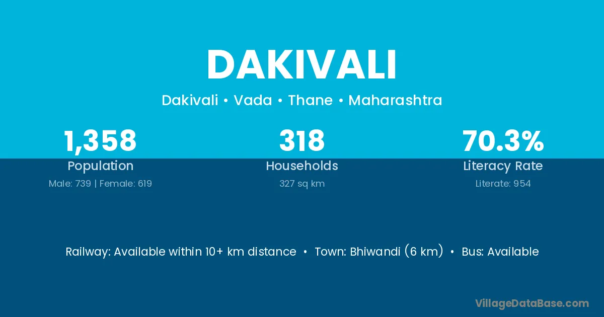 Bhiwandi (6 km) is the nearest town to Dakivali village for major economic activities and is located approximately 6 km away.