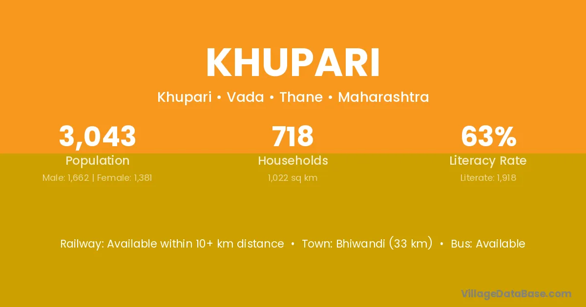 Bhiwandi (33 km) is the nearest town to Khupari village for major economic activities and is located approximately 33 km away.