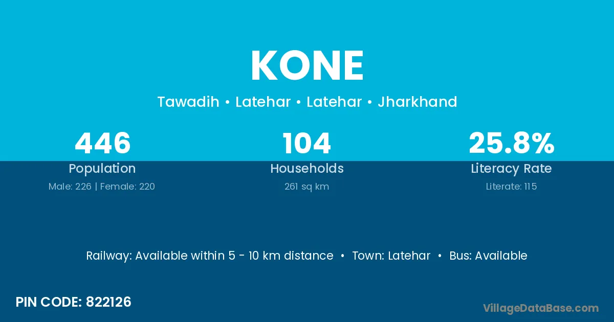 The literacy rate of Kone village is 68.61%. Male literacy stands at 77.20% and female literacy at 59.14%.