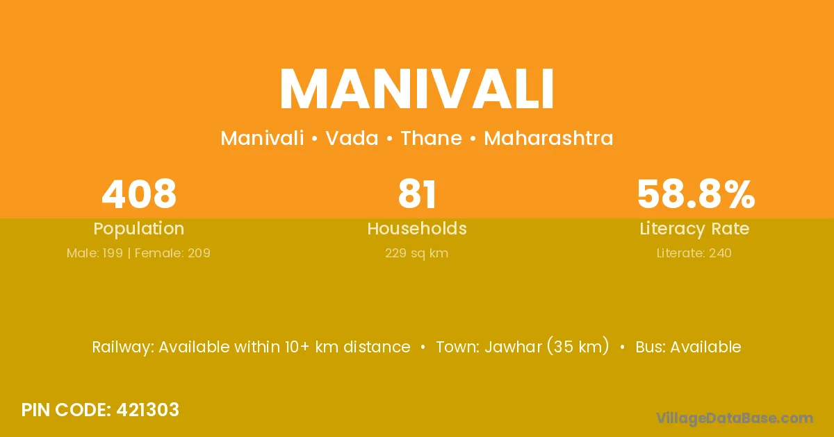 Jawhar (35 km) is the nearest town to Manivali village for major economic activities and is located approximately 35 km away.