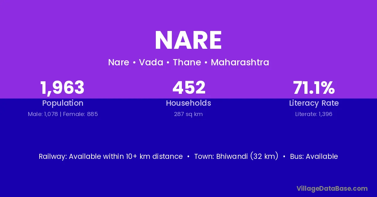 Bhiwandi (32 km) is the nearest town to Nare village for major economic activities and is located approximately 32 km away.