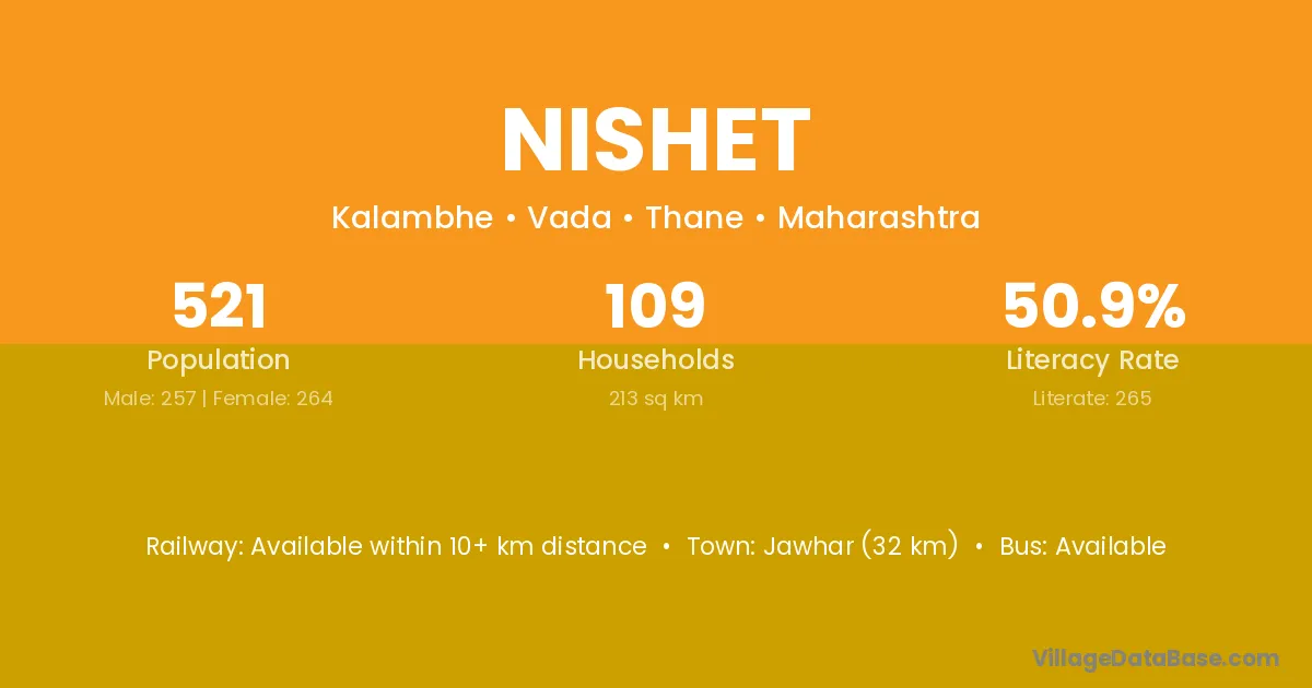 Jawhar (32 km) is the nearest town to Nishet village for major economic activities and is located approximately 32 km away.
