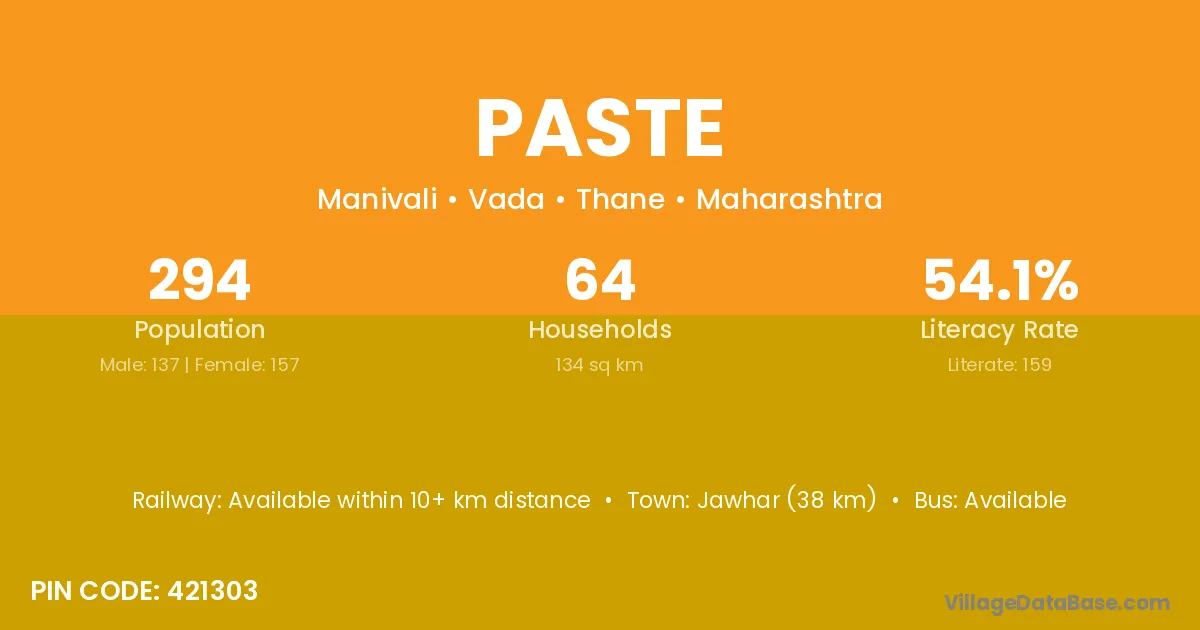 Jawhar (38 km) is the nearest town to Paste village for major economic activities and is located approximately 38 km away.