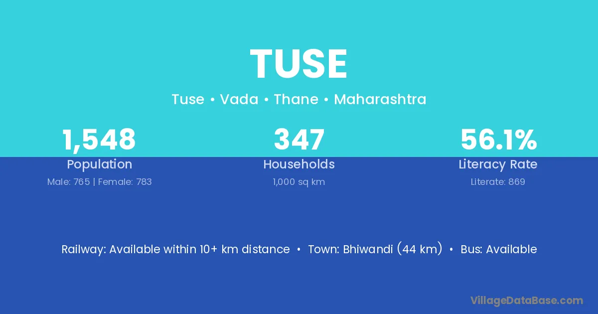 Bhiwandi (44 km) is the nearest town to Tuse village for major economic activities and is located approximately 44 km away.