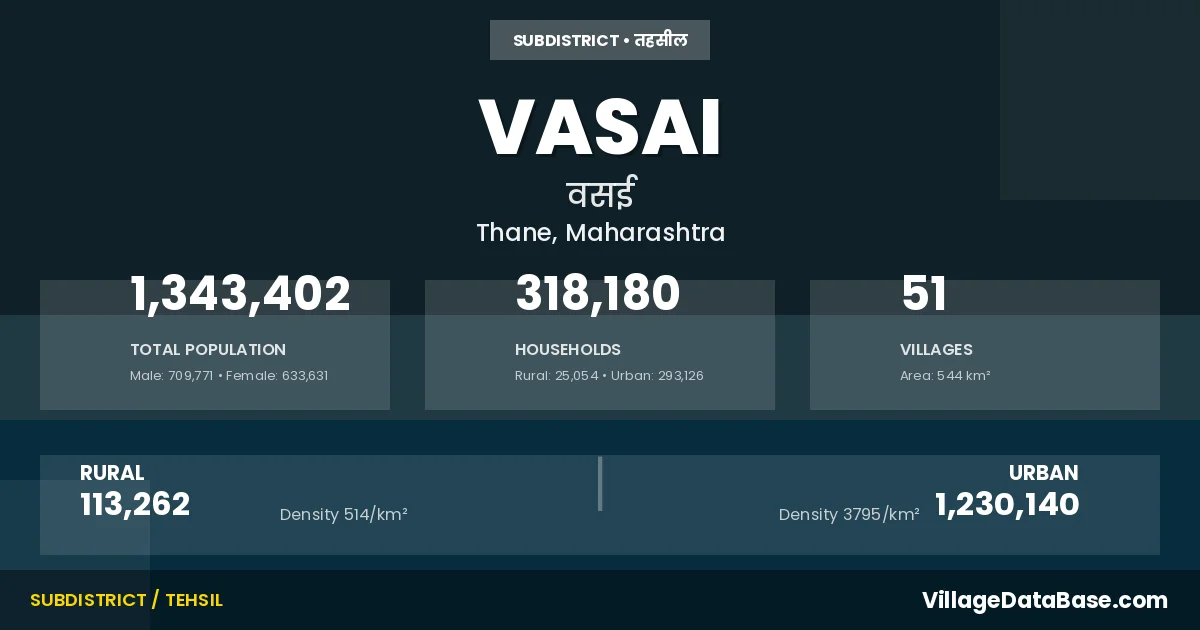According to the 2011 census The total area of Vasai Tehsil is 544 km², with a population of 1343402 people. The population density is 2,468 inhabitants per square kilometre, and there are approximately 318180 houses in the sub district.