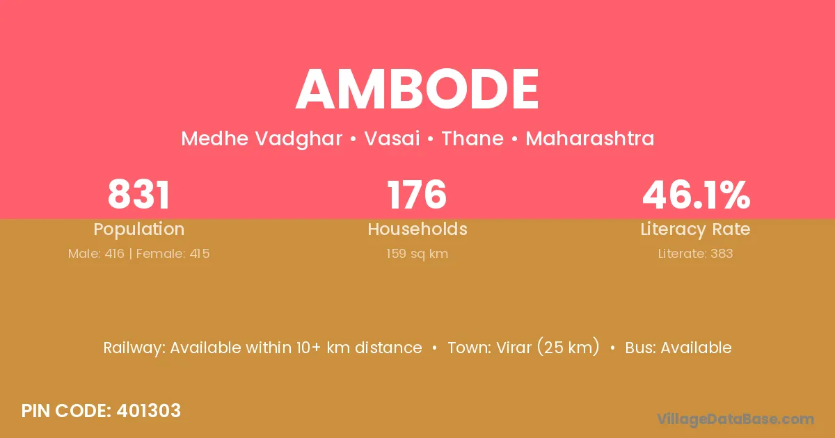 Virar (25 km) is the nearest town to Ambode village for major economic activities and is located approximately 25 km away.