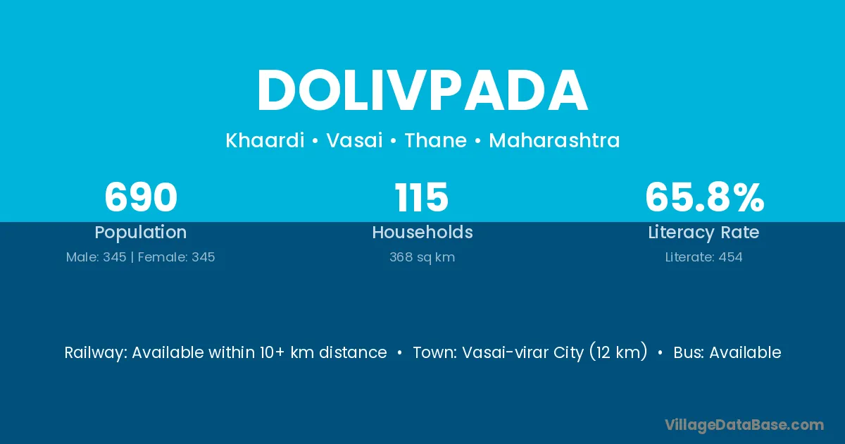 Vasai-virar City (12 km) is the nearest town to Dolivpada village for major economic activities and is located approximately 12 km away.