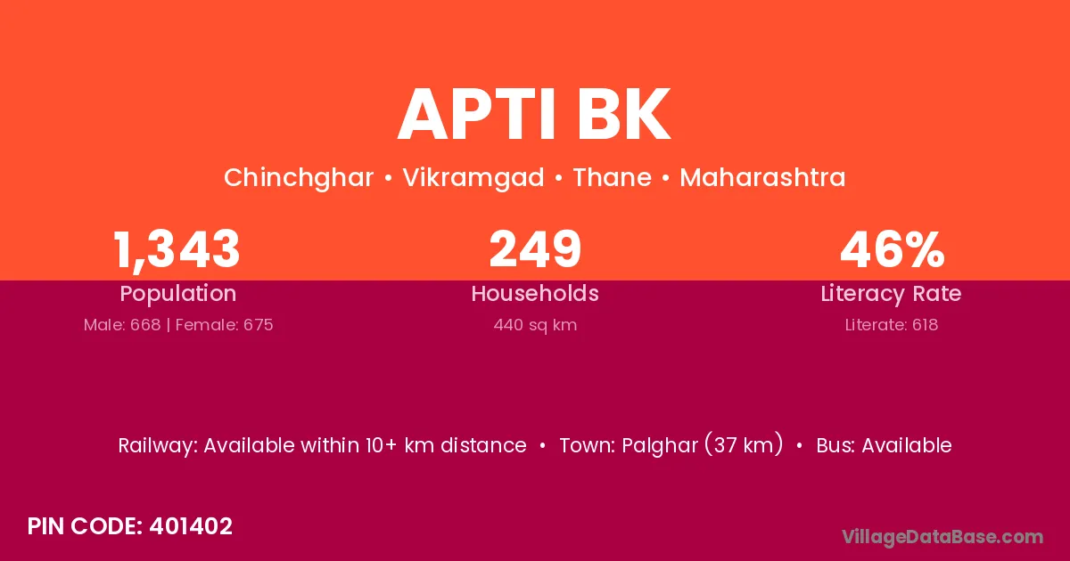 Palghar (37 km) is the nearest town to Apti Bk village for major economic activities and is located approximately 37 km away.