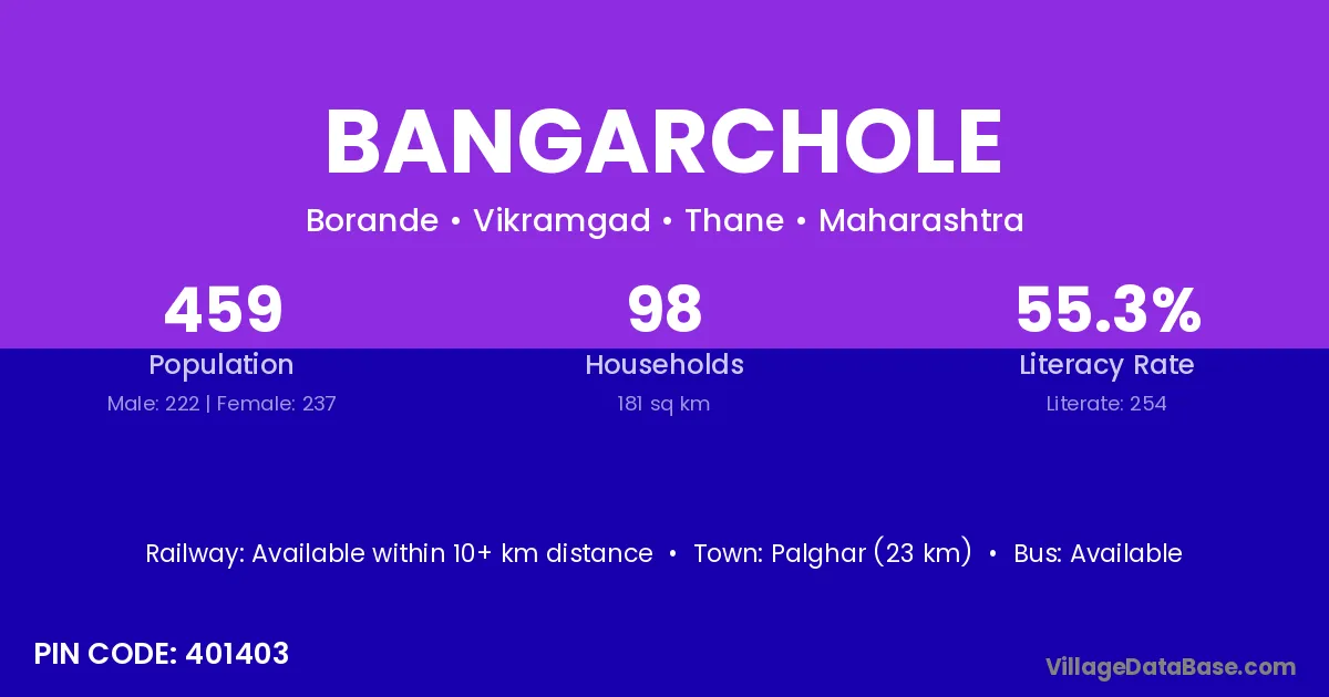 Palghar (23 km) is the nearest town to Bangarchole village for major economic activities and is located approximately 23 km away.