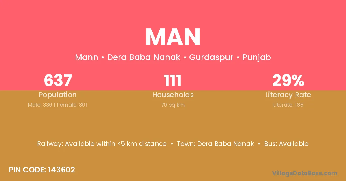 The literacy rate of Man village is 67.30%. Male literacy stands at 72.07% and female literacy at 62.92%.