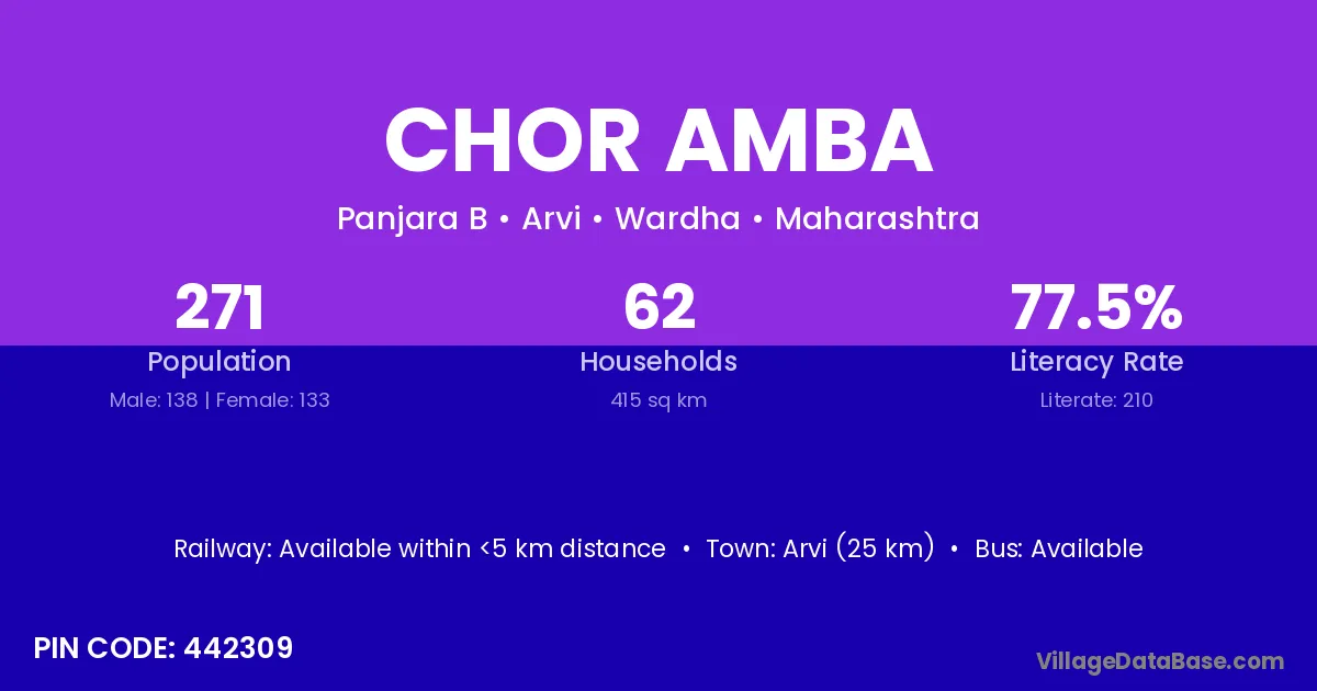 Arvi (25 km) is the nearest town to Chor Amba village for major economic activities and is located approximately 25 km away.