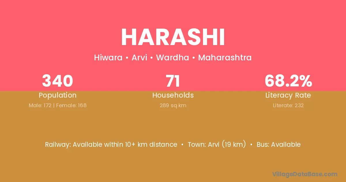 Arvi (19 km) is the nearest town to Harashi village for major economic activities and is located approximately 19 km away.