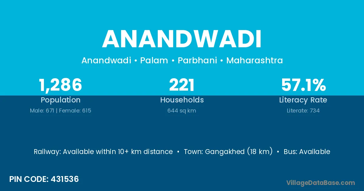 Arvi (25 km) is the nearest town to Anandwadi village for major economic activities and is located approximately 25 km away.