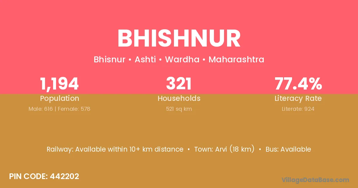 Arvi (18 km) is the nearest town to Bhishnur village for major economic activities and is located approximately 18 km away.