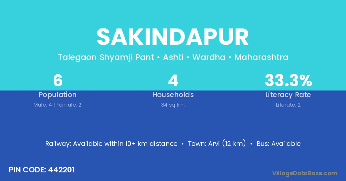 Arvi (12 km) is the nearest town to Sakindapur village for major economic activities and is located approximately 12 km away.