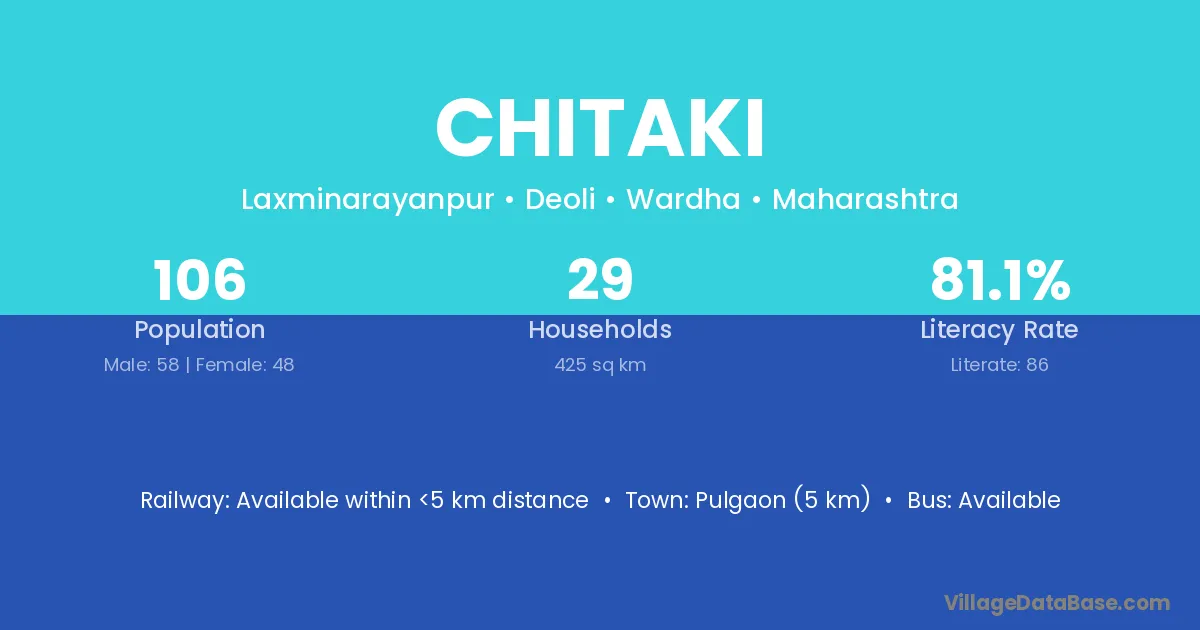 Pulgaon (5 km) is the nearest town to Chitaki village for major economic activities and is located approximately 5 km away.