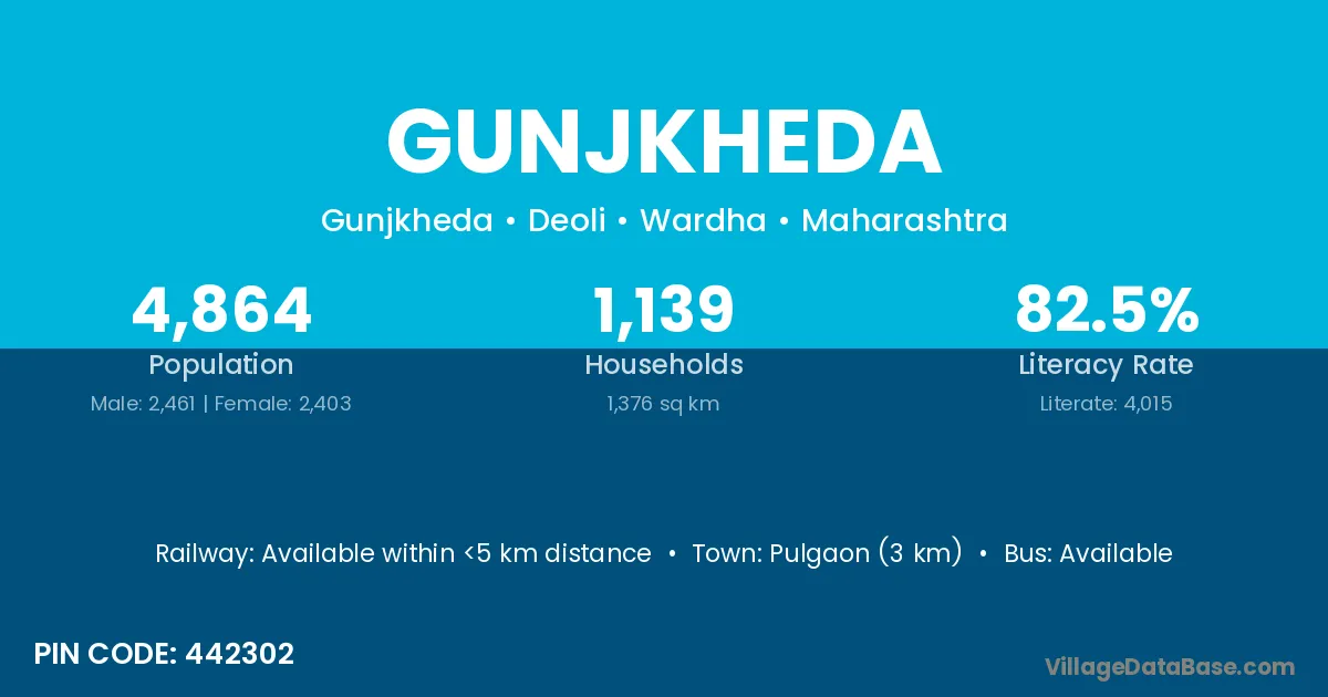 Pulgaon (3 km) is the nearest town to Gunjkheda village for major economic activities and is located approximately 3 km away.