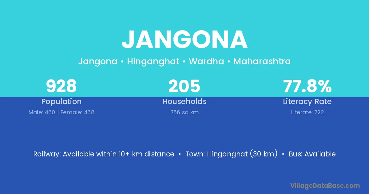 Hinganghat (30 km) is the nearest town to Jangona village for major economic activities and is located approximately 30 km away.