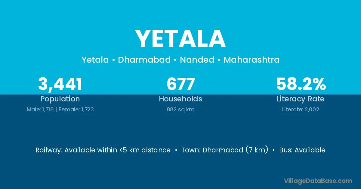 Hinganghat (11 km) is the nearest town to Yetala village for major economic activities and is located approximately 11 km away.