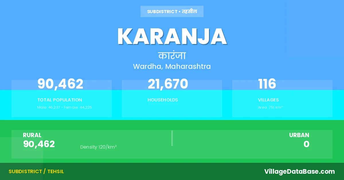 According to the 2011 census The total area of Karanja Tehsil is 751 km², with a population of 90462 people. The population density is 120 inhabitants per square kilometre, and there are approximately 21670 houses in the sub district.