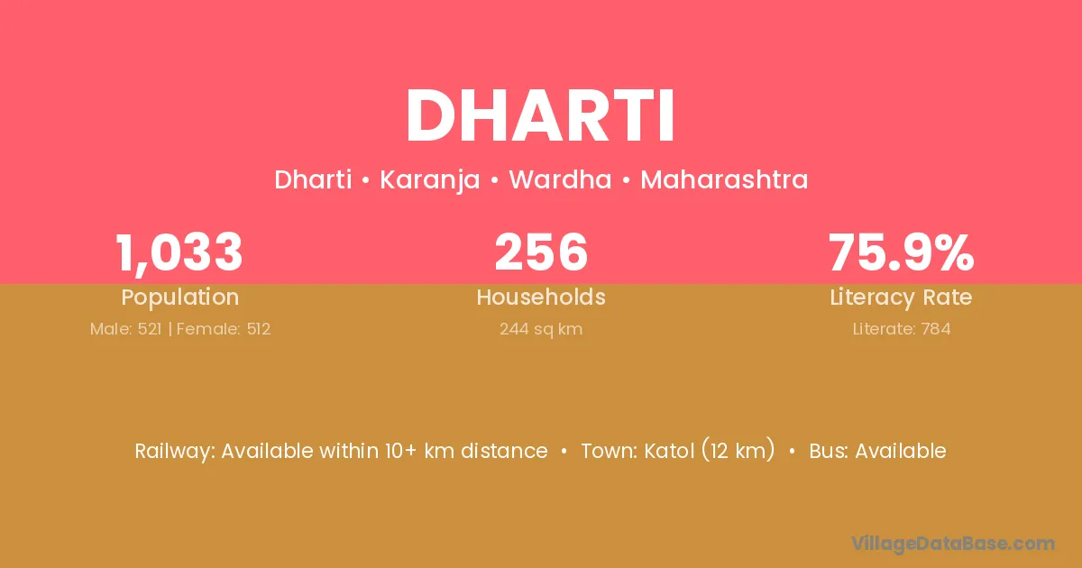 Katol (12 km) is the nearest town to Dharti village for major economic activities and is located approximately 12 km away.