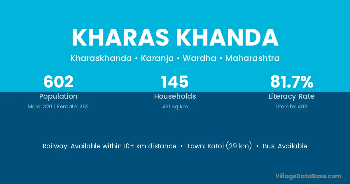 Katol (29 km) is the nearest town to Kharas Khanda village for major economic activities and is located approximately 29 km away.