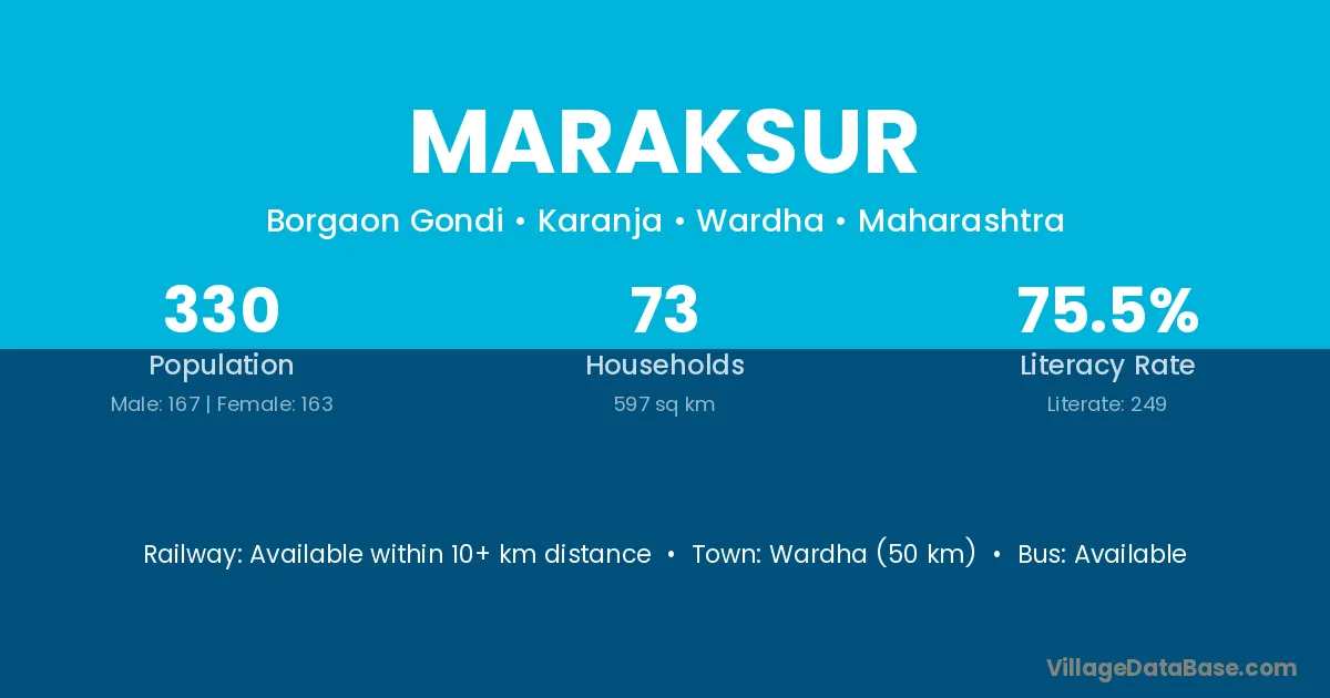 Wardha (50 km) is the nearest town to Maraksur village for major economic activities and is located approximately 50 km away.