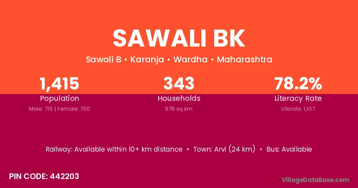 Arvi (24 km) is the nearest town to Sawali Bk village for major economic activities and is located approximately 24 km away.