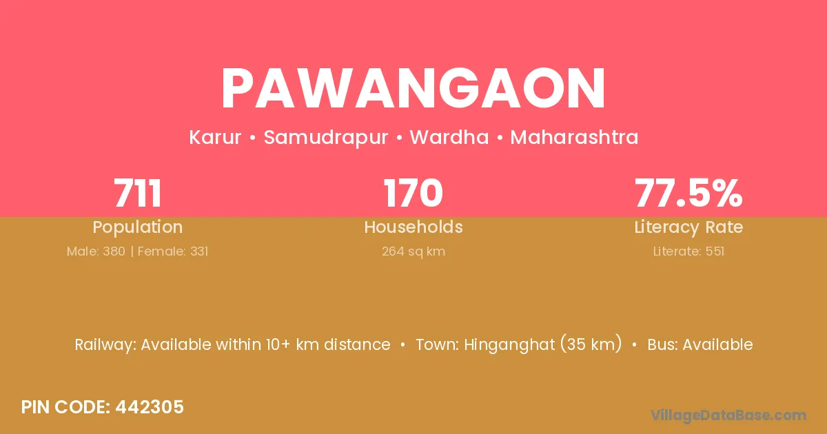 Hinganghat (35 km) is the nearest town to Pawangaon village for major economic activities and is located approximately 35 km away.