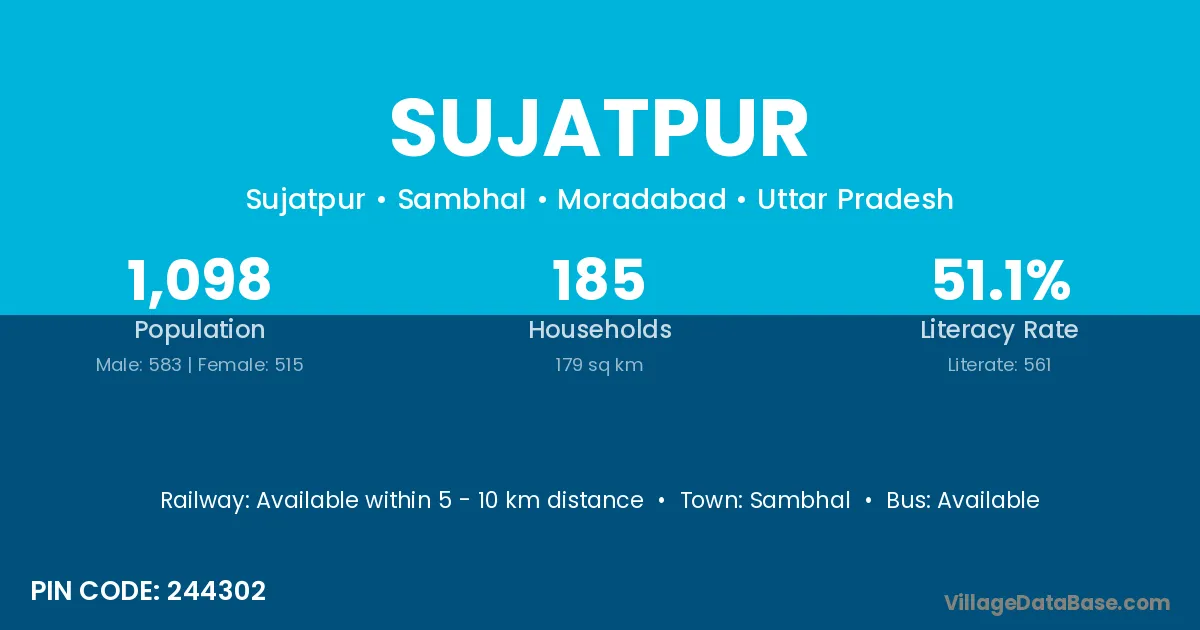 The literacy rate of Sujatpur village is 77.55%. Male literacy stands at 83.28% and female literacy at 70.73%.