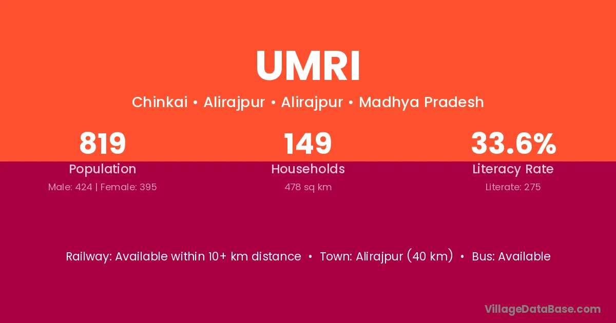The literacy rate of Umri village is 72.95%. Male literacy stands at 78.78% and female literacy at 66.67%.
