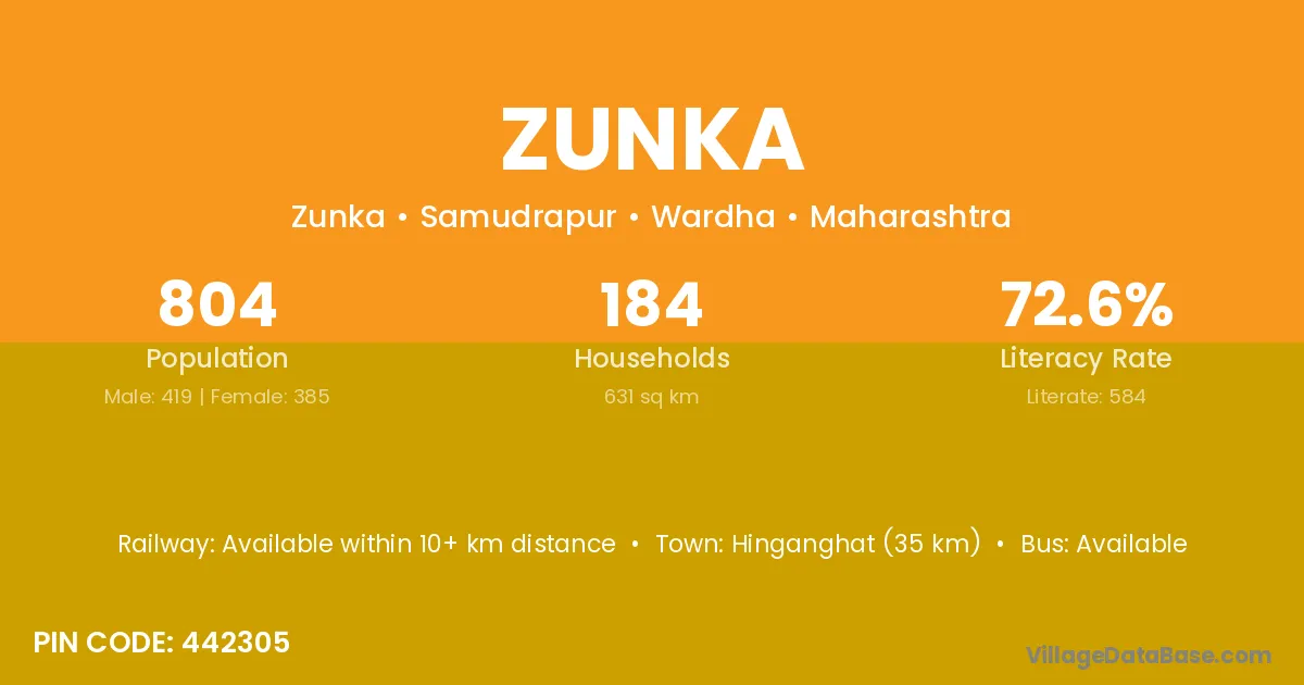 Hinganghat (35 km) is the nearest town to Zunka village for major economic activities and is located approximately 35 km away.