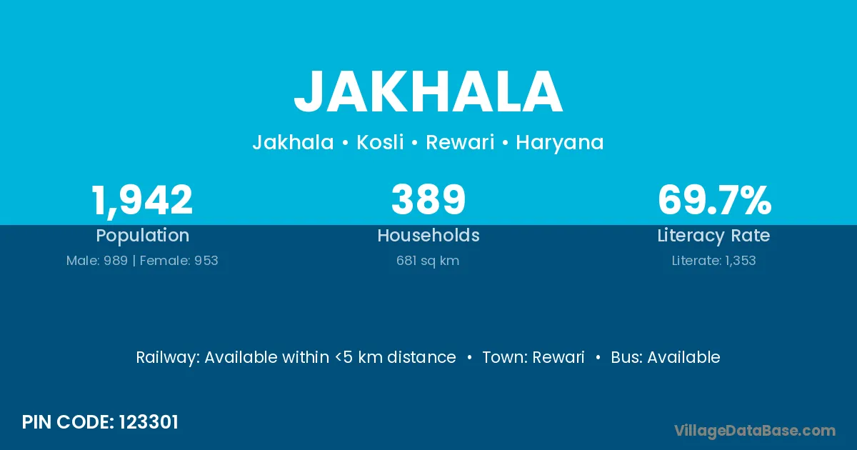The literacy rate of Jakhala village is 67.78%. Male literacy stands at 71.79% and female literacy at 64.71%.