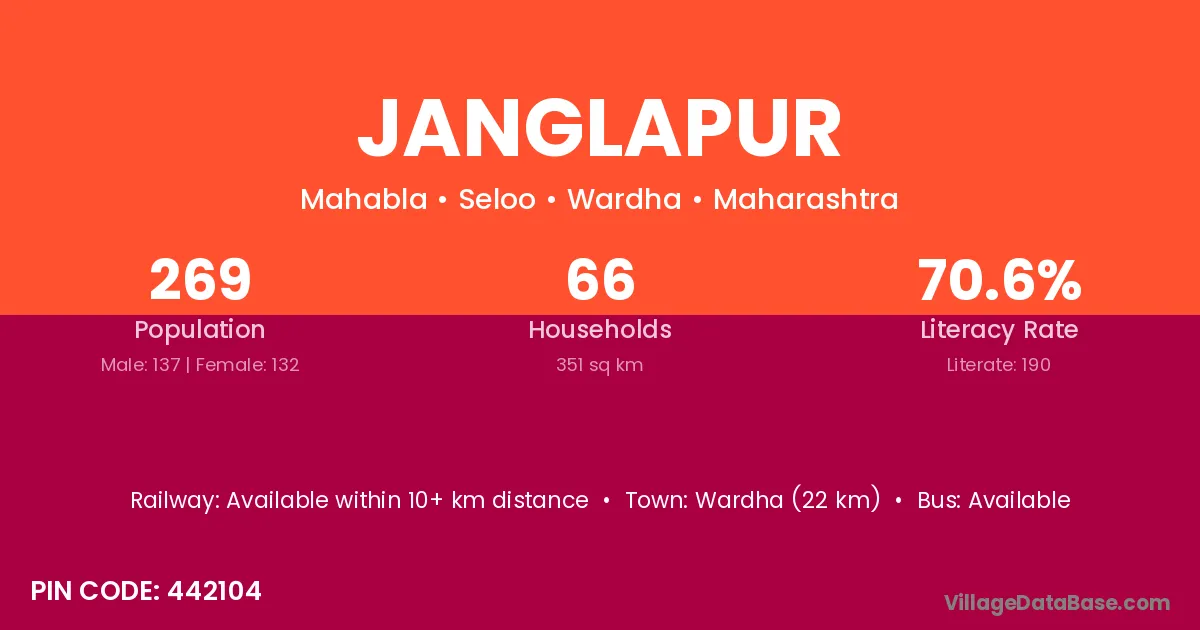 Wardha (22 km) is the nearest town to Janglapur village for major economic activities and is located approximately 22 km away.