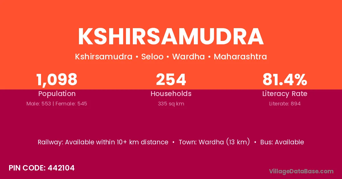 Wardha (13 km) is the nearest town to Kshirsamudra village for major economic activities and is located approximately 13 km away.