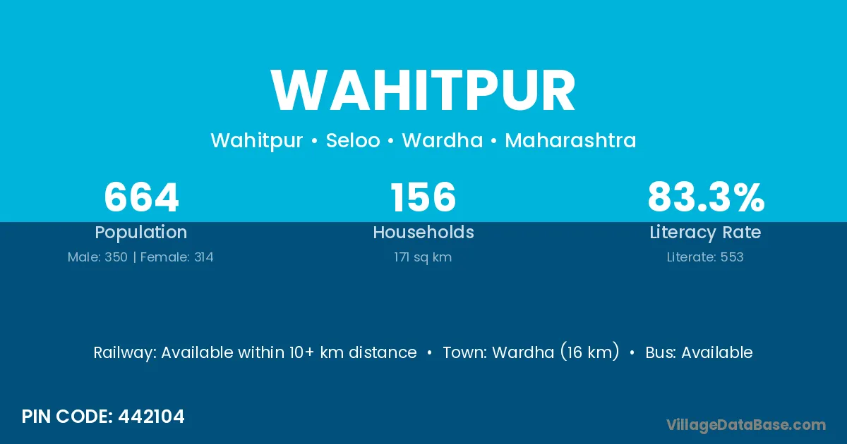 Wardha (16 km) is the nearest town to Wahitpur village for major economic activities and is located approximately 16 km away.