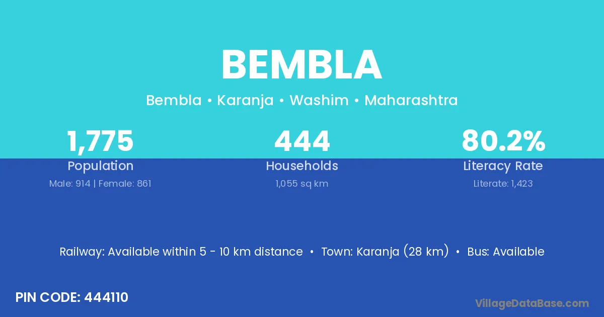 Karanja (28 km) is the nearest town to Bembla village for major economic activities and is located approximately 28 km away.