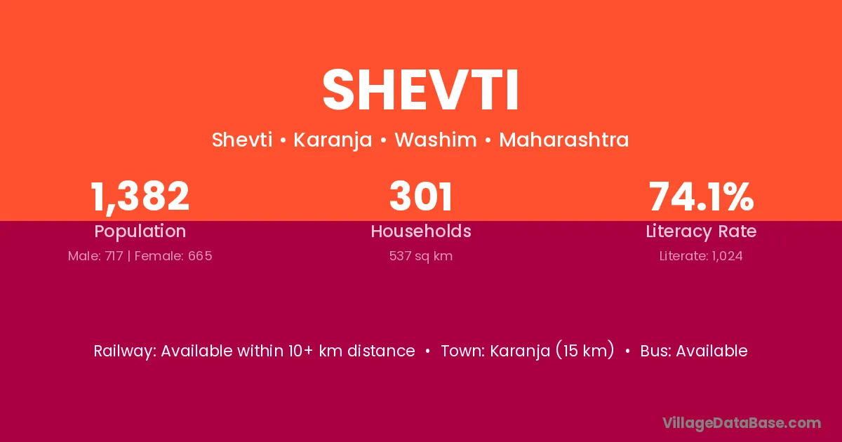 Karanja (15 km) is the nearest town to Shevti village for major economic activities and is located approximately 15 km away.