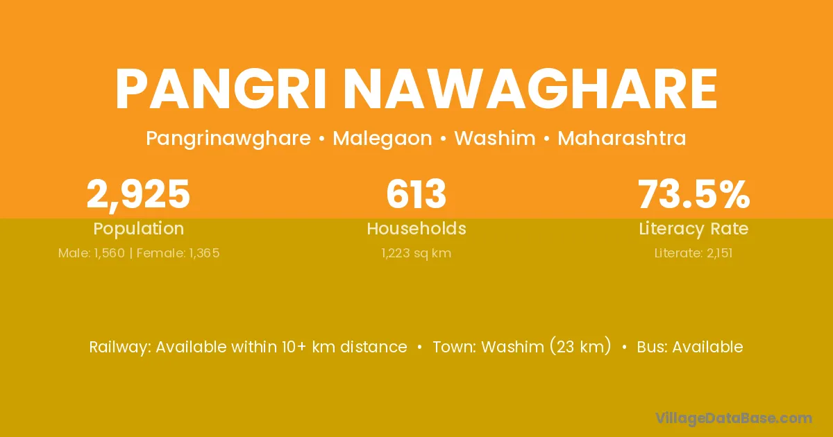 Washim (23 km) is the nearest town to Pangri Nawaghare village for major economic activities and is located approximately 23 km away.