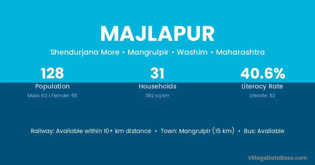 Mangrulpir (15 km) is the nearest town to Majlapur village for major economic activities and is located approximately 15 km away.