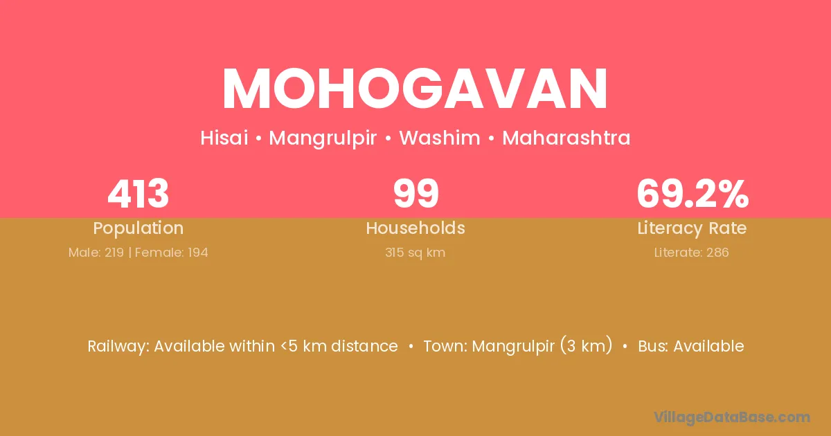 Mangrulpir (3 km) is the nearest town to Mohogavan village for major economic activities and is located approximately 3 km away.