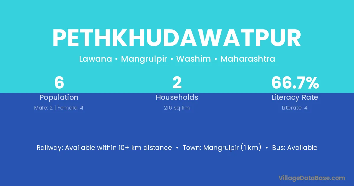 Mangrulpir (1 km) is the nearest town to Pethkhudawatpur village for major economic activities and is located approximately 1 km away.