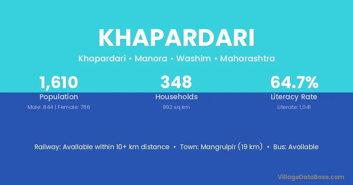 Mangrulpir (19 km) is the nearest town to Khapardari village for major economic activities and is located approximately 19 km away.