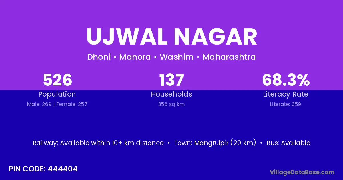 Mangrulpir (20 km) is the nearest town to Ujwal Nagar village for major economic activities and is located approximately 20 km away.