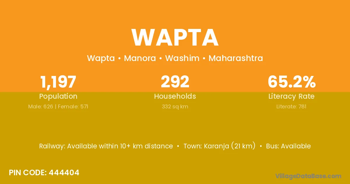 Karanja (21 km) is the nearest town to Wapta village for major economic activities and is located approximately 21 km away.