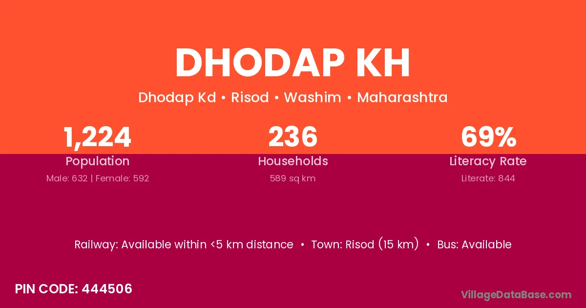 Risod (15 km) is the nearest town to Dhodap Kh village for major economic activities and is located approximately 15 km away.