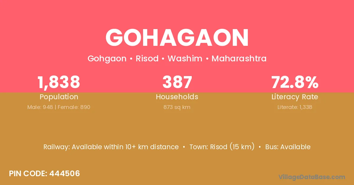 Risod (15 km) is the nearest town to Gohagaon village for major economic activities and is located approximately 15 km away.